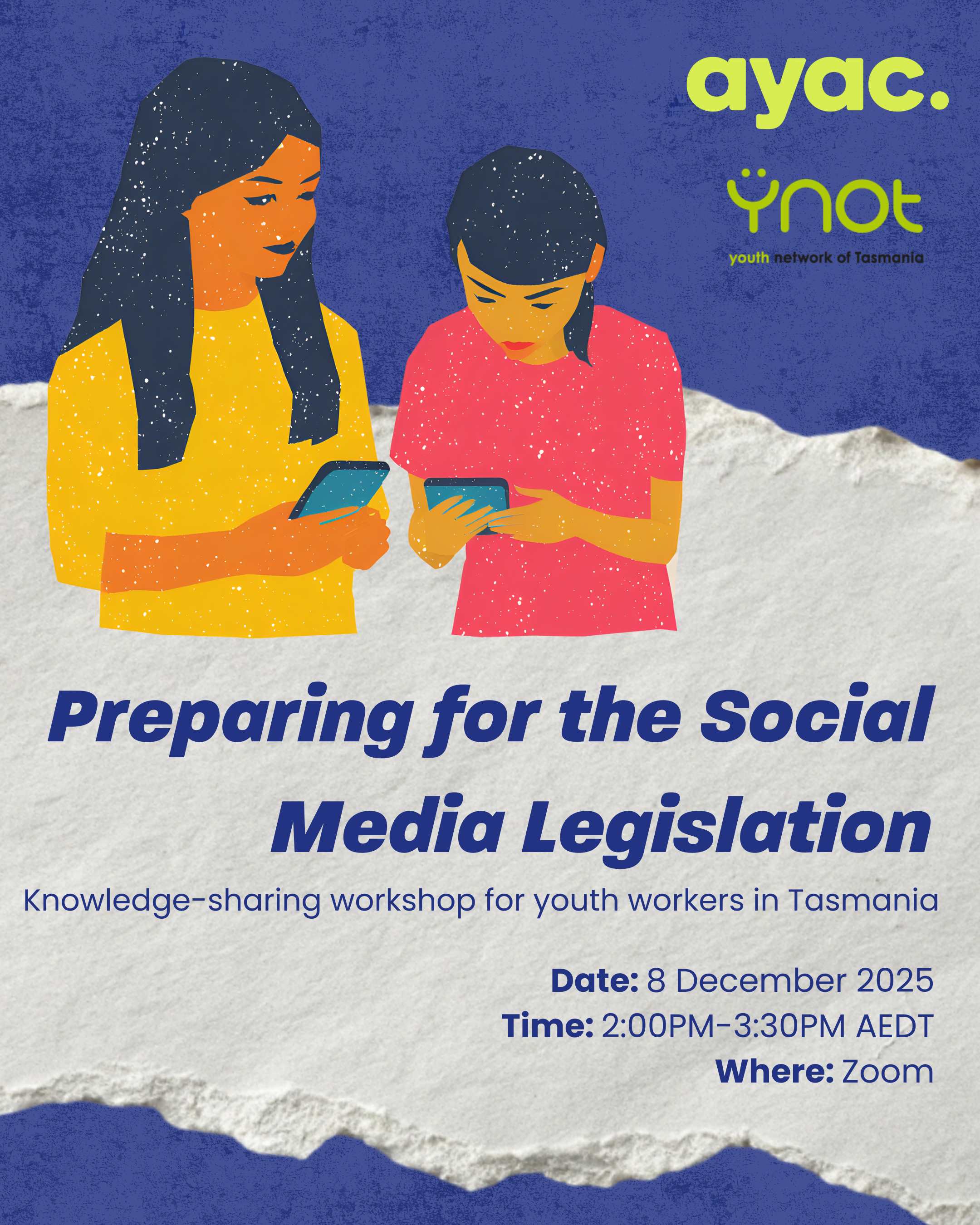 Join the Youth Network of Tasmania (YNOT) and the Australian Youth Affairs Coalition (AYAC) for a free online workshop examining the upcoming social media legislation affecting young people under 16. This 1.5-hour session is for workers to better understand the implications for youth work practice, it's impacts on young people, and ways the sector can adapt and continue to support the young people we work with.
